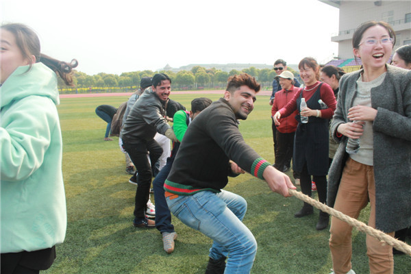 图为bat365平台官网留学生们正在拔河 摄影:荣艺