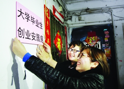 昨天,武昌区水陆社区工作人员正在挂牌“大学毕业生创业安居房”。近日,该社区整合出了辖区10套房屋,以优先、优惠的条件,面向大学毕业生出租。社区负责人称,为创业大学生“筑巢”,意在助力毕业生在武汉顺利过渡安家。今后他们还将整合出更多的“创业安居房”,服务好每一位在武汉创业的大学毕业生。