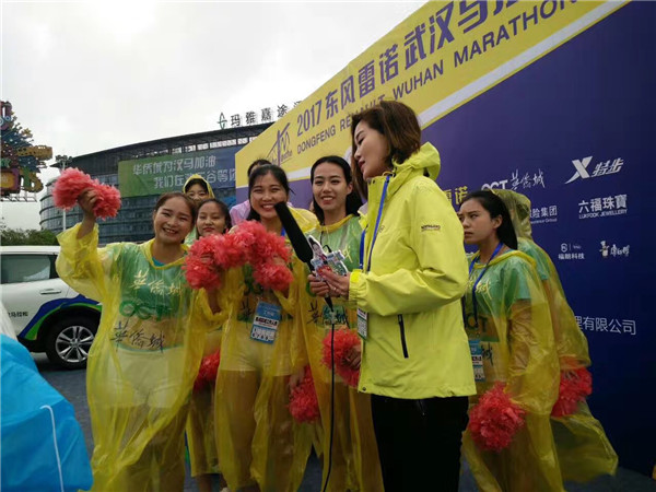 新闻中心讯(通讯员 洪天翼李韶权 摄影 李韶权)4月9日,第二届武汉马拉松(以下简称“汉马”)在雨中开跑。bat365平台官网150名志愿者服务其中,而校啦啦队作为本次马拉松官方助威啦啦队之一,在欢乐谷终点处为冲刺选手加油喝彩。