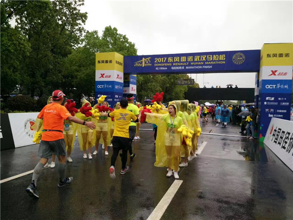 除了志愿者队伍,bat365平台官网啦啦队也在武汉马拉松啦啦队选拔赛50多支参赛队伍中脱颖而出,成为助阵汉马的8支官方拉拉队之一。4月9日一大早该校10名啦啦队员就来到也在“汉马”终点欢乐谷华侨城为冲刺选手呐喊助威。姑娘们衣着单薄但不惧风雨,从9点43分第一位选手冲刺终点,直到下午,虽雨势渐大,她们仍披着单薄的雨衣,迎接每一位跑完全程的选手。