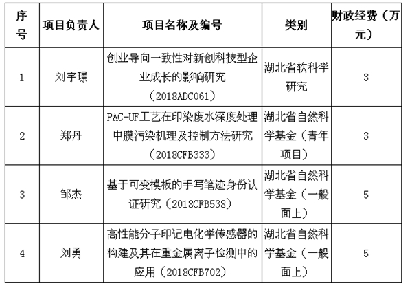 新闻中心讯(特约记者 曾荷爱)近日,湖北省科技厅下发了《关于下达2018年湖北省科技计划项目(第一批)的通知》(鄂科技发计﹝2018﹞3号),武汉工商学院获批2018年度湖北省科技计划项目4其中2项湖北省自然科学基金一般面上项目,1项湖北省自然科学基金青年项目,1湖北省技术创新专项(软科学研究)项目,总资助经费16万。总立项数和总立项经费均创历史新高,立项数位居全省同类高校前列。具体立项情况见下表: