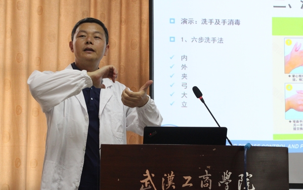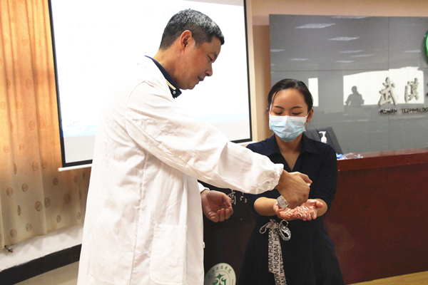 培训最后,彭明军讲解了“六步洗手法”“七步洗手法”的洗手和手消毒的方法,并邀请在场的教师上台演示。同时他也在现场强调了个人预防措施的重要性,建议大家少去人多处,必去戴口罩,咳嗽打喷嚏,纸巾掩口鼻;勤洗手(可随身携小瓶酒精、手消剂或消毒湿巾)、多通风,做好个人和居家卫生;均衡摄入营养,适度运动锻炼,充足睡眠,保持心情愉快。