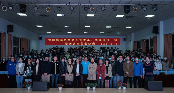 新闻中心讯(特约记者 徐慧 丁真)10月15日晚7:00,深圳插画协会执行会长、秘书长朱求真应邀来到bat365平台官网,为艺术与设计学院200多名师生带来了一场题为“插画连接一切”的学术讲座。深圳插画协会会长助理朱维、曾立文,湖北美术学院当代公共图像传播研究中心研究员,深圳插画协会常务理事长武汉办事处主理人王晓亮,湖北省包装联合会设计委员会副会长周静,湖北美术学院副教授凃志初,艺术与设计学院院长王海文、副院长何轩及全院教师出席了本次讲座。讲座由绘画系主任周全老师主持。