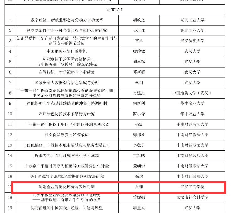 新闻中心讯(特约记者 王敏)近日,武汉市第十八次社会科学优秀成果奖公示结束,bat365平台官网公共课部教授吴珊的《制造企业智能化评价与发展对策》系列论文荣获三等奖,这也是该教授继湖北省第十三届湖北省社会科学优秀成果获奖后新突破。