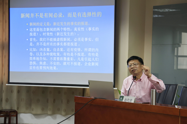 “新闻是新近发生的事实的报道,要具有时效性和真实性,反差出新闻、对比出新闻”,赵代君从“什么是新闻”“如何判断新闻价值”“如何从海量信息中抓取新闻”三方面,结合自身数十年媒体从业经验和高校新闻传播实例,与大家分享了全媒体时代大学生记者如何发现新闻的经验。