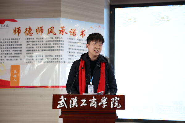 管理学院张斟作为新教师代表发言,他认为此次新教师培训是一次宝贵的学习机会,不仅可以和新教师们交流学习,也可以向优秀教师前辈们请教学习、汲取经验,期待在此次培训中收获更多的知识,补齐自身短板。