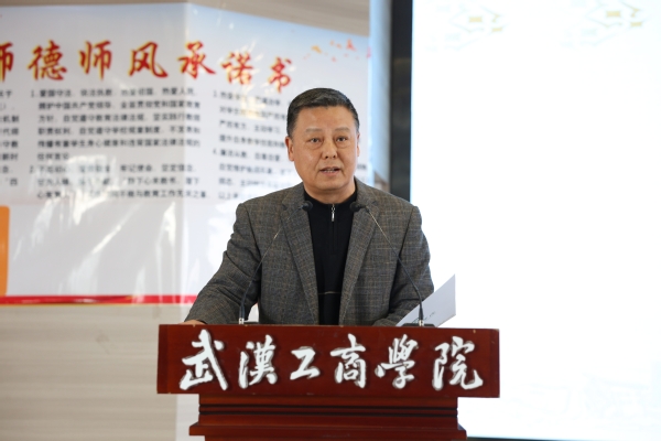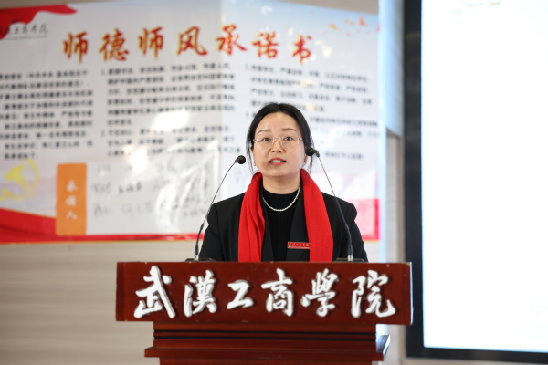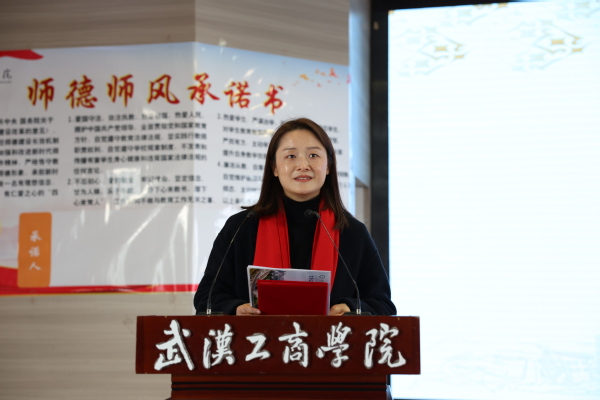 刘生元书记为新教师代表佩戴校徽,衷心祝贺新教师们成为武工商的一份子,并带领大家举行新教师入职宣誓仪式,签署《教师师德承诺书》。
