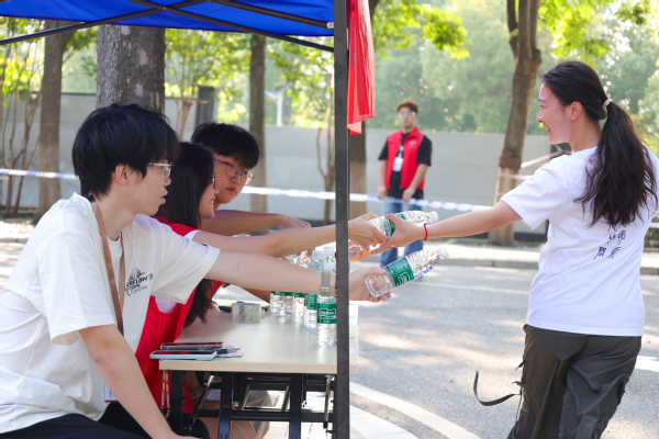 图为补给站志愿者给学生递水 摄影:张泳和