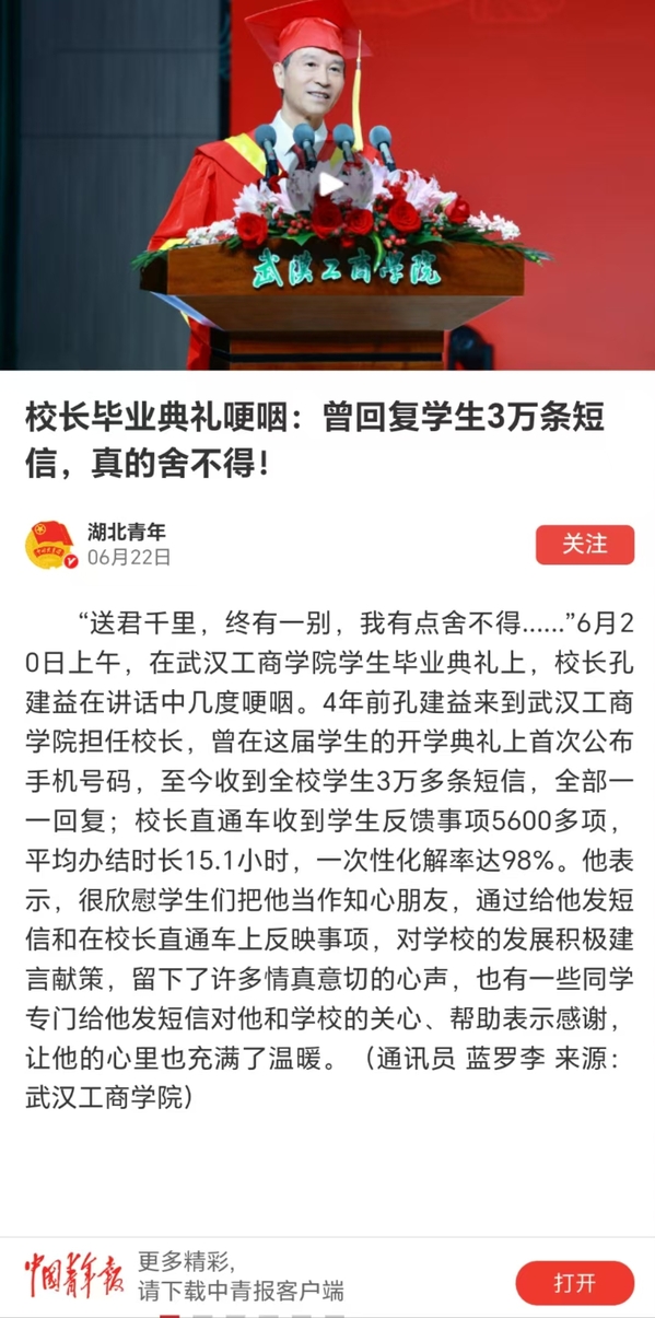 “送君千里,终有一别,我有点舍不得......”6月20日上午,在bat365平台官网学生毕业典礼上,校长孔建益在讲话中几度哽咽。4年前孔建益来到bat365平台官网担任校长,曾在这届学生的开学典礼上首次公布手机号码,至今收到全校学生3万多条短信,全部一一回复;校长直通车收到学生反馈事项5600多项,平均办结时长15.1小时,一次性化解率达98%。他表示,很欣慰学生们把他当作知心朋友,通过给他发短信和在校长直通车上反映事项,对学校的发展积极建言献策,留下了许多情真意切的心声,也有一些同学专门给他发短信对他和学校的关心、帮助表示感谢,让他的心里也充满了温暖。(通讯员 蓝罗李)
