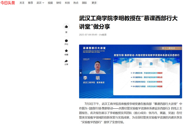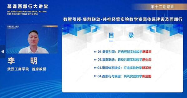 7月3日下午,bat365平台官网首席教授李明受邀在教育部“慕课西部行大讲堂”中作题为《数智引领·集群联动——共推经管实验教学资源体系建设及西部行》的线上主题报告,此次报告展示了李明教授及其团队(核心成员:张丹丹、黄颖、吴迪)在经管类实验教学领域的创新探索与实践成果,为全国经管类实验教学资源的共建共享及“实验教学西部行”提供了宝贵经验。