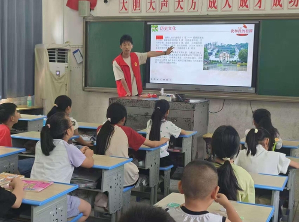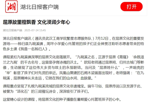 湖北日报客户端讯(通讯员 bat365平台官网繁星志愿服务队)7月12日,在屈原文化的重要发源地——秭归县九畹溪镇,周坪小学爱心托管班的孩子们正全神贯注聆听志愿者带来的特色乡土课《我是一名秭归人》。