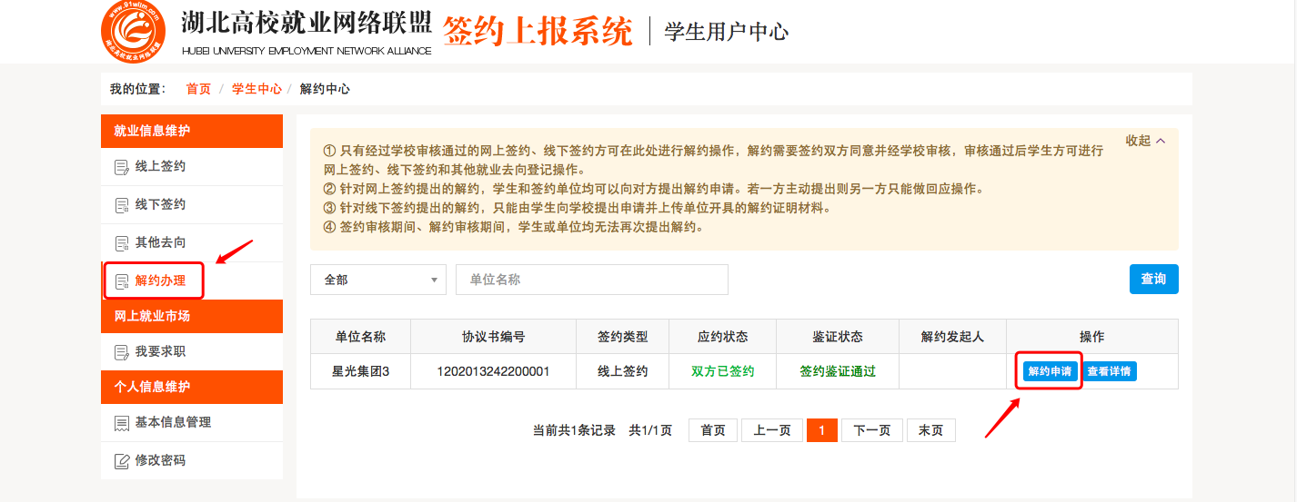 学生在解约办理模块可以看到当前签约已鉴证审核通过的信息,通过条目右侧的“解约申请”按钮进行解约操作。