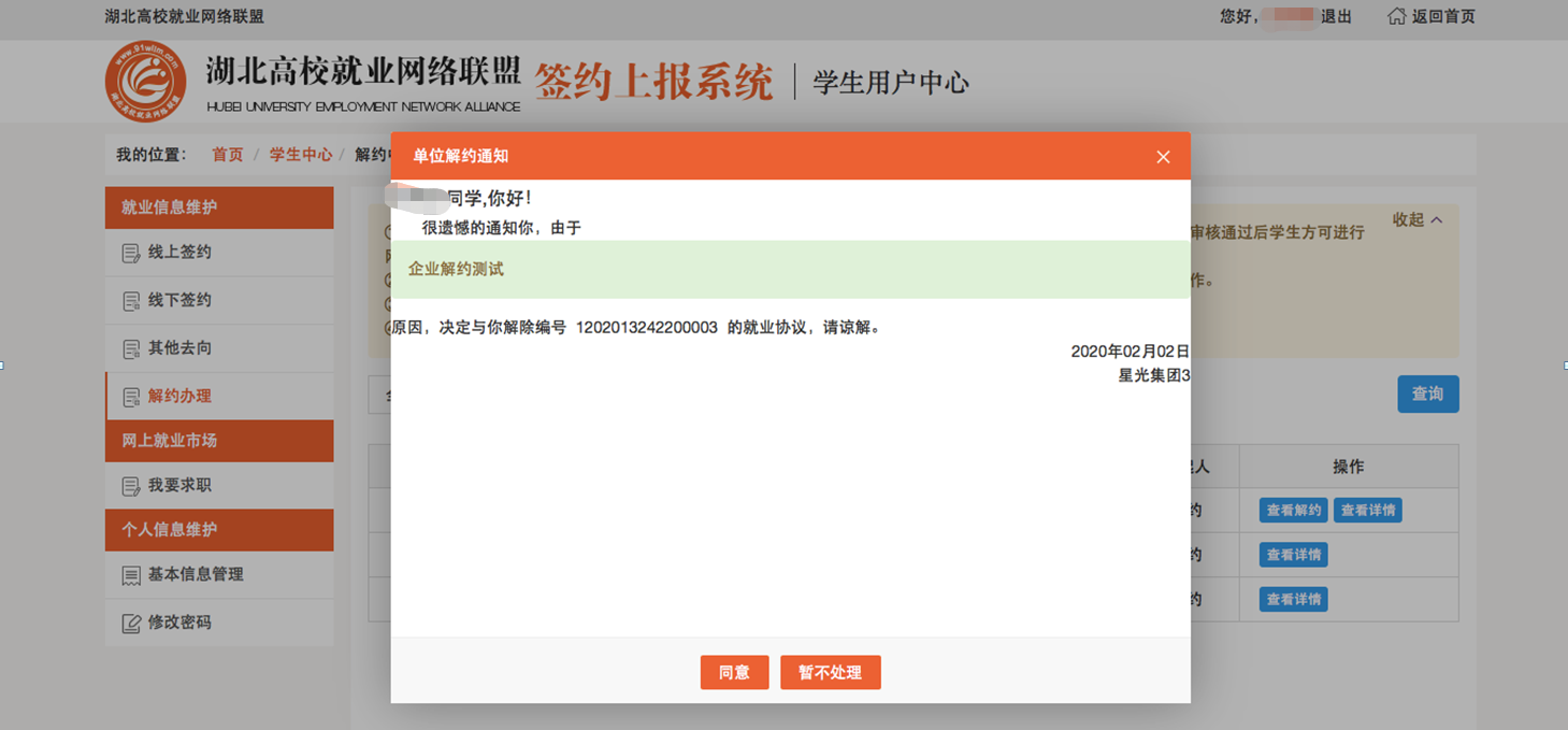 若单位向学生提出解约,仍然在该条目处进行操作,只不过按钮名称会自动变成“查看解约”,此时学生点击按钮后会出现单位发出的解约通知。