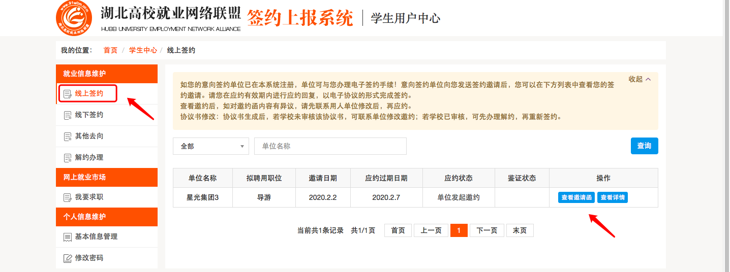 (1)学生能且只能与唯一一家单位签约,一旦签约后,其他邀请函只能查看,无法操作;