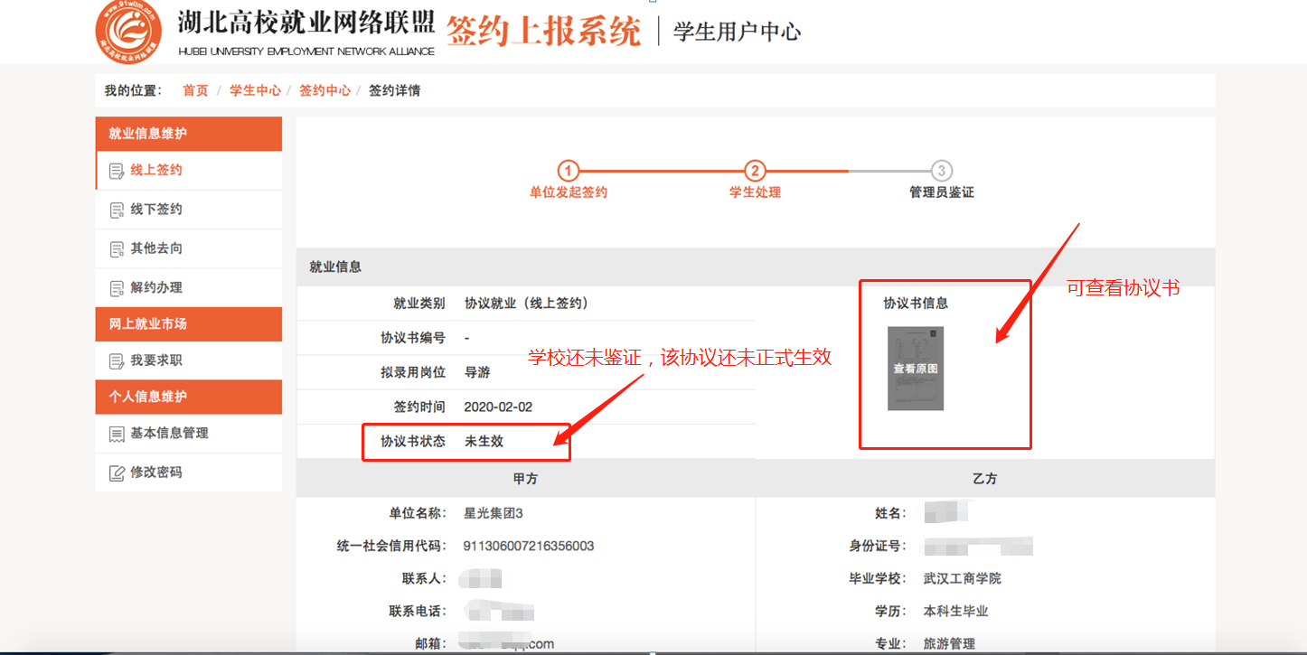 同意后,签约双方形成电子协议书,等待学校老师鉴证。此时学生可以查看签约详情。