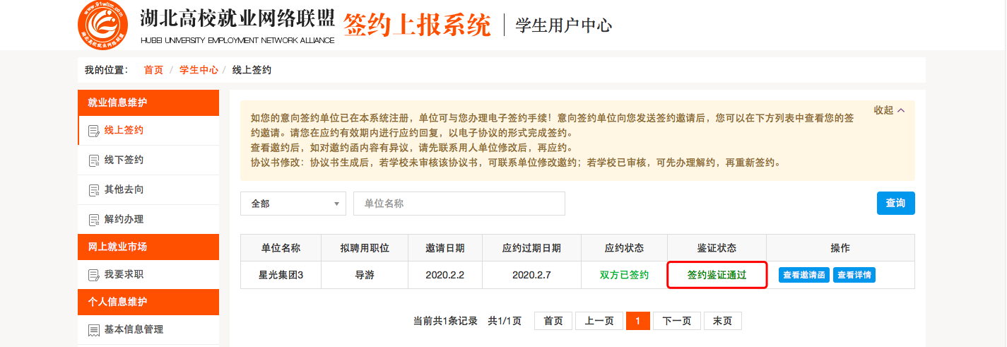鉴证通过,则此次签约完成,形成就业信息。鉴证不通过,学生可继续同其他单位签约。