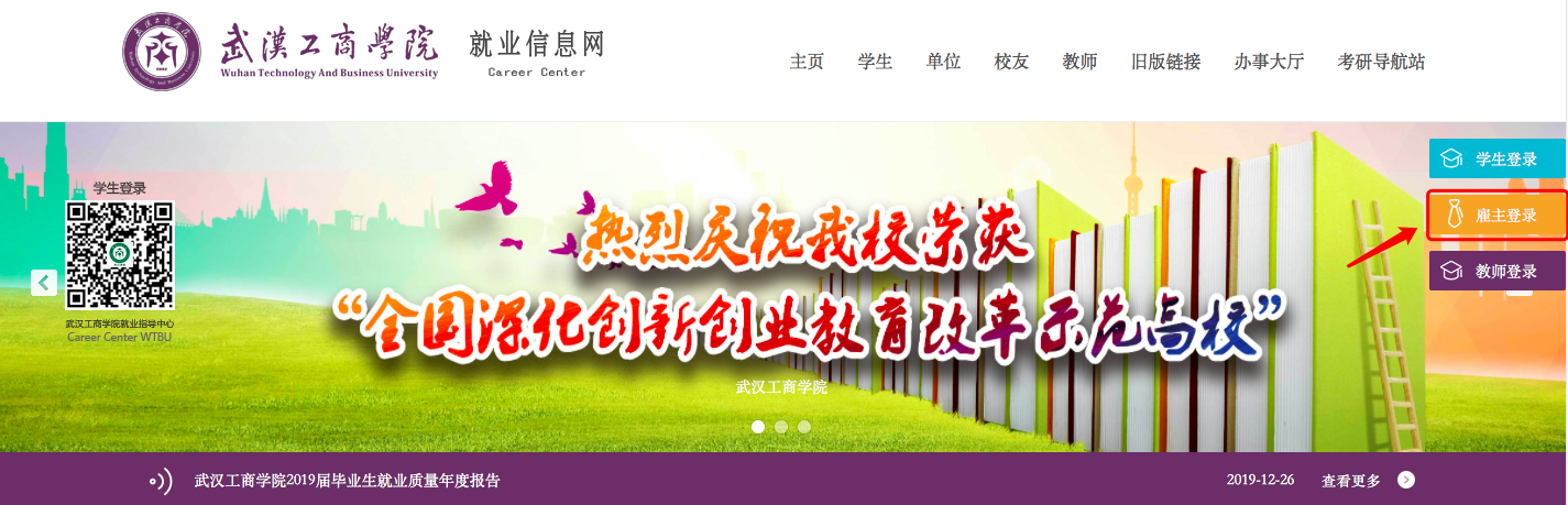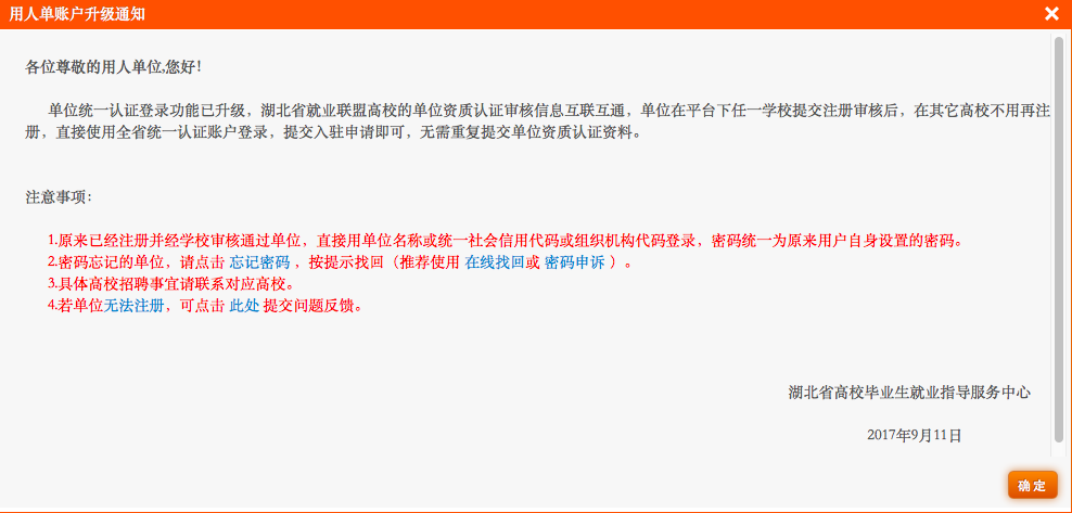 1、已申请湖北高校就业网络联盟的单位,直接登录bat365平台官网就业信息网:https://wtbu.91wllm.com,点击右上角“雇主登录”--”确定“--输入用户名、密码”登录。