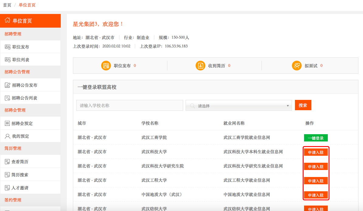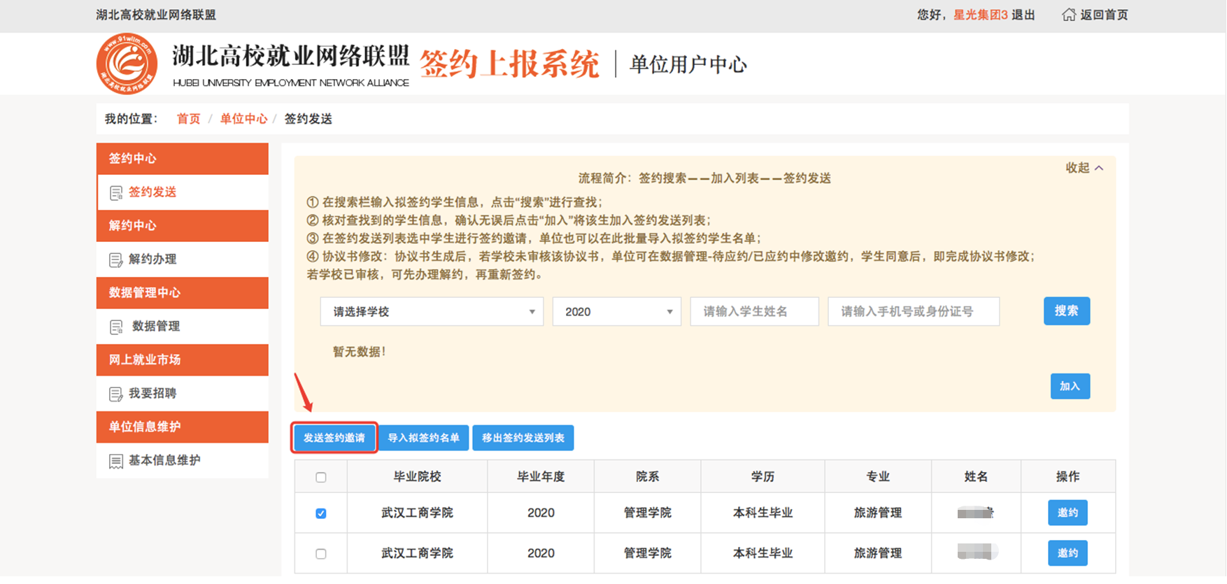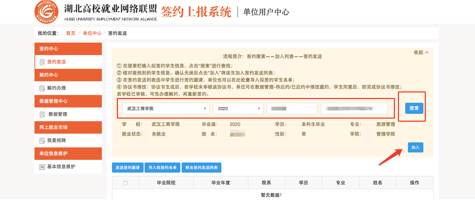 签约中心主要功能是搜索或者导入准备邀约的学生,然后加入邀约列表;在邀约列表中单个/批量给相关学生发送邀约。单位需在湖北高校就业网络联盟网站(www.91wllm.com)申请入驻过该学校并经审核通过,方可对签约学校的学生发起邀约,若暂未入驻请先入驻,如图: