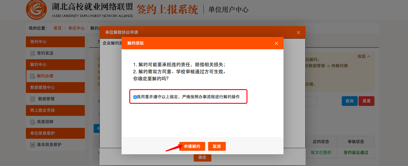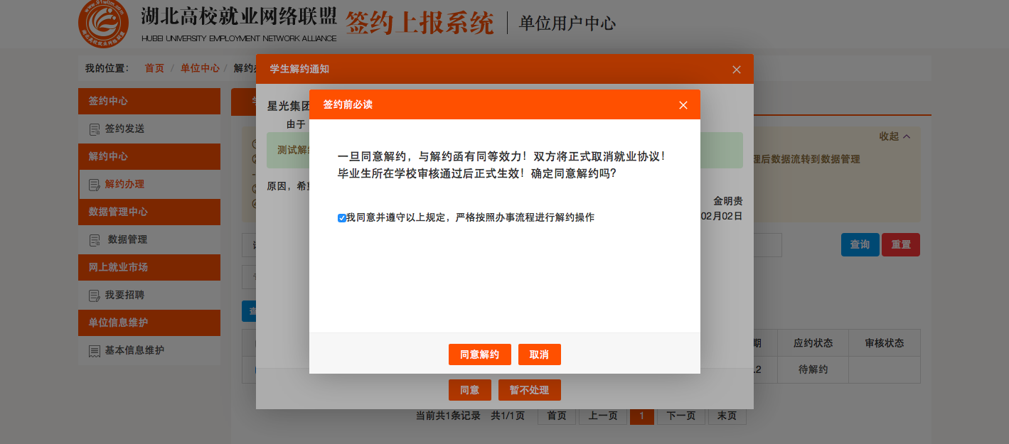 (1)如果同意,点击“同意”时,系统会弹出“解约须知”确认框,再次点击“同意解约”按钮即解约成功。单位同意解约后提交学校审核鉴证,鉴证通过后解约完成。