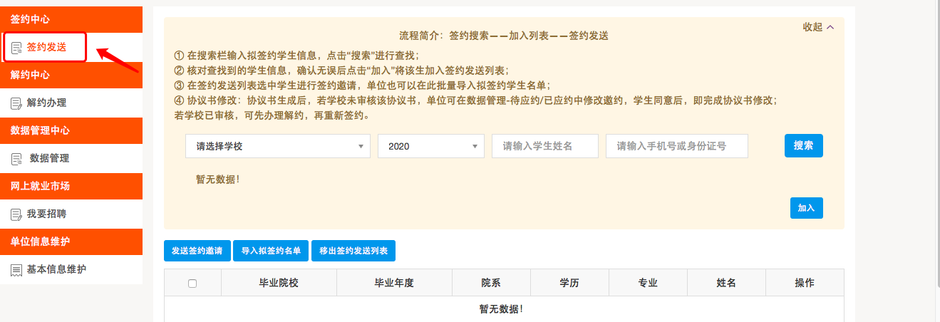 1、在“签约中心”中,选择“签约发送”,如图:输入学校—姓名—毕业年份—学生手机号或身份证号,这四项内容全对,才能搜索到对应学生,点击搜索。