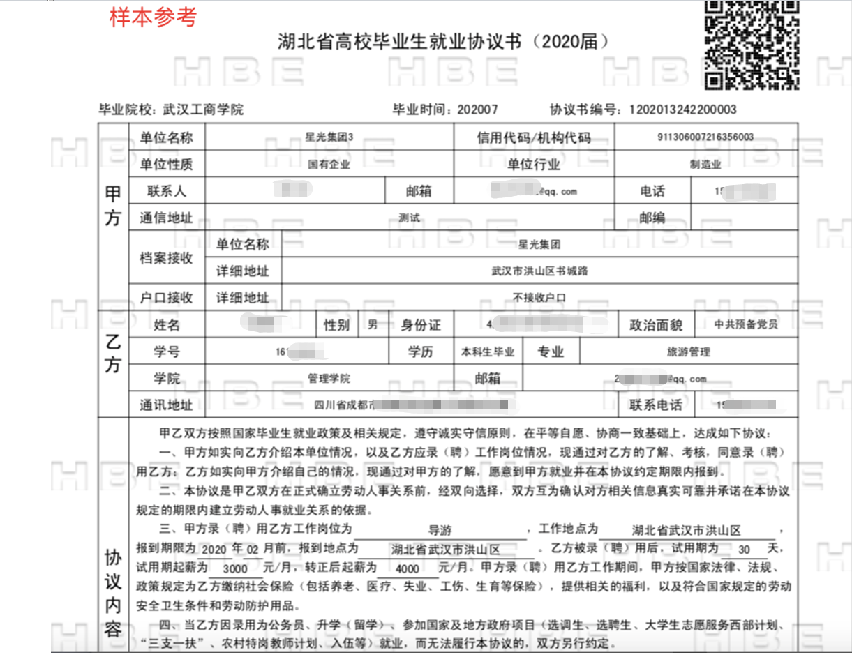 学校每日定期审核协议,鉴证完毕后系统生成电子版《湖北省高校毕业生就业协议书》,协议正式生效。样式如下图: