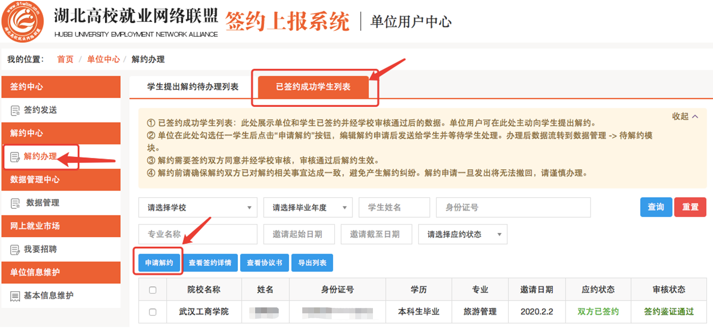 (1)在点击“解约办理”-“已签约成功学生列表”--选择要解约的学生点击“申请解约”。