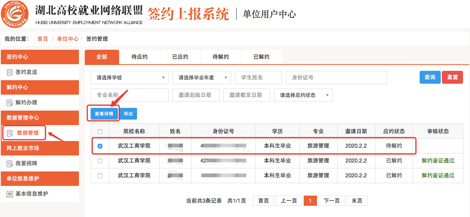 等待学生做出应约答复的数据将会流转到“数据管理中心 -> 待应约”模块中,学生同意签约后,数据流转到“数据管理中心 -> 已应约”模块中。