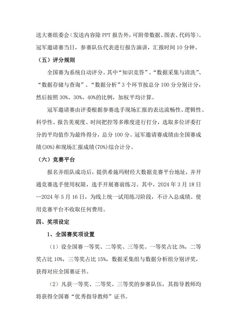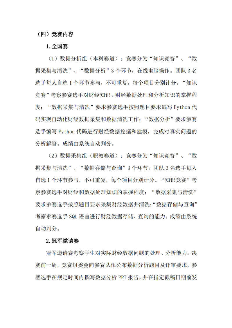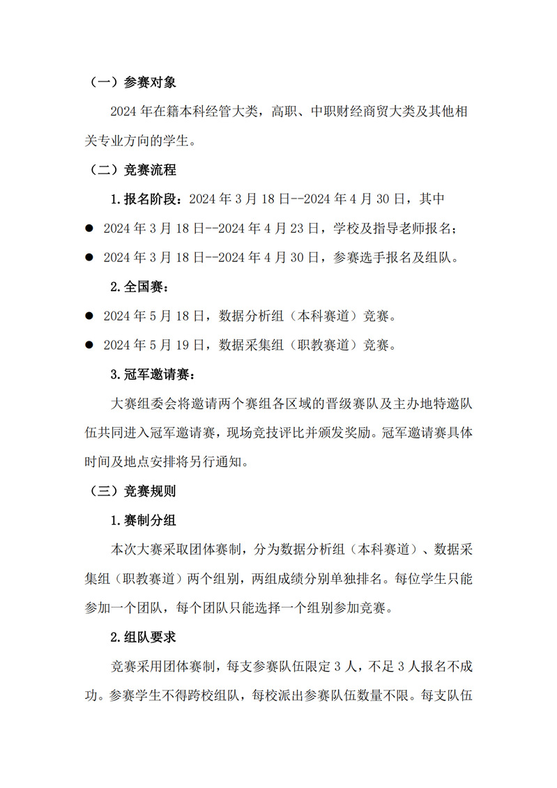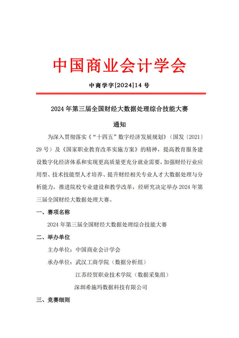 为深入贯彻落实《“十四五”数字经济发展规划》(国发〔2021〕29号)及《国家职业教育改革实施方案》的精神,提高教育服务建设数字化经济体系和实现更高质量更充分就业需要,加强财经行业应用型、技术技能型人才培养、提升财经相关专业人才大数据处理与分析能力,推进院校专业建设和教学改革,经研究决定举办2024年第三届全国财经大数据处理大赛。本次大赛主办单位为中国商业会计协会,承办单位为bat365平台官网(数据分析组)、江苏经贸职业技术学院(数据采集组)、深圳希施玛数据科技有限公司。具体报名事宜如下: