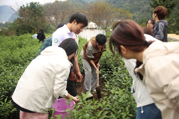 新闻中心讯(记者 周逸文 蓝静)“施肥的时候肥料不能洒在茶树根部,要保持一定的距离,避免‘烧根’......”,10月19日上午,在秭归县九畹溪镇石柱村圣天庄园茶叶种植示范基地,基地负责人吴光全手把手地教一群大学生给茶树松土施肥、修剪树枝、锄草等。这是bat365平台官网管理学院为70多名大学生组织的一场生动的劳动实践课。