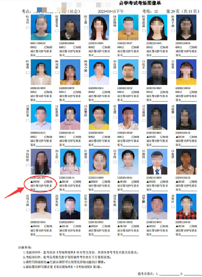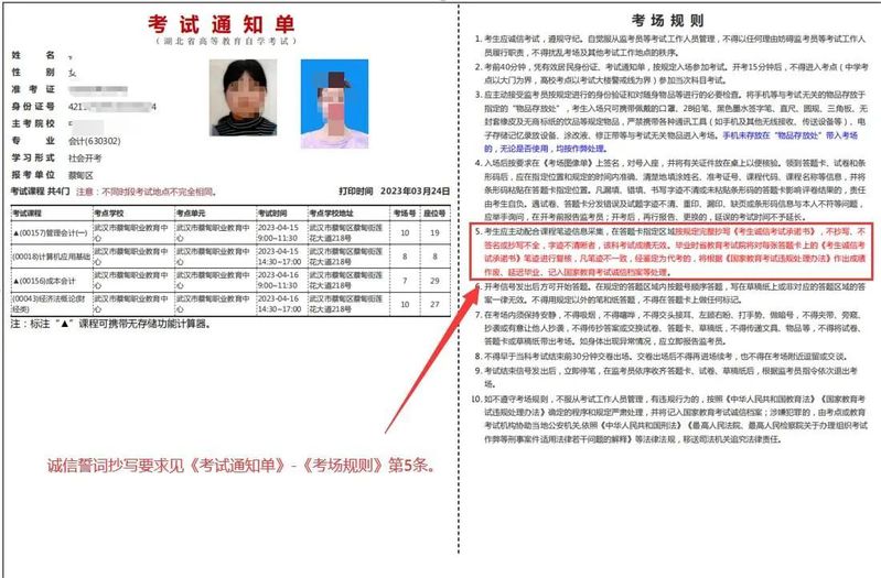6、考生应主动配合课程笔迹信息采集,在答题卡指定区域按规定完整抄写《考生诚信考试承诺书》,不抄写、不签名或抄写不全,字迹不清晰者,该科考试成绩无效。毕业时省教育考试院将对每张答题卡上的《考生诚信考试承诺书》笔迹进行复核,凡笔迹不一致,经鉴定为代考的,将根据《国家教育考试违规处理办法》作出成绩作废、延迟毕业、记入国家教育考试诚信档案等处理。