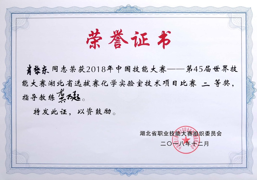 5 | 2018 | 肖黎东 | 45届世界技能大赛湖北省选拔赛化学实验室技术项目大赛 | 湖北省人力资源和社会保障厅 | 二等奖 |