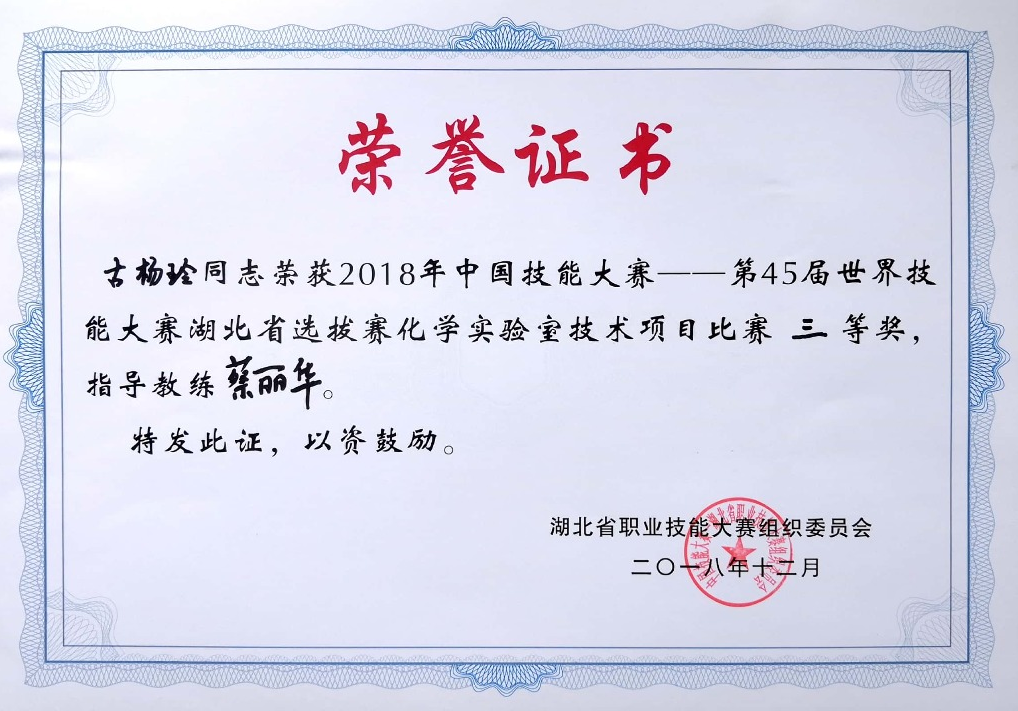 6 | 2018 | 古杨玲 | 45届世界技能大赛湖北省选拔赛化学实验室技术项目大赛 | 湖北省人力资源和社会保障厅 | 三等奖 |