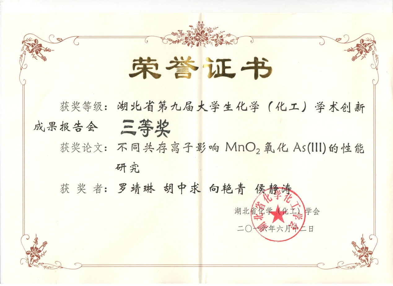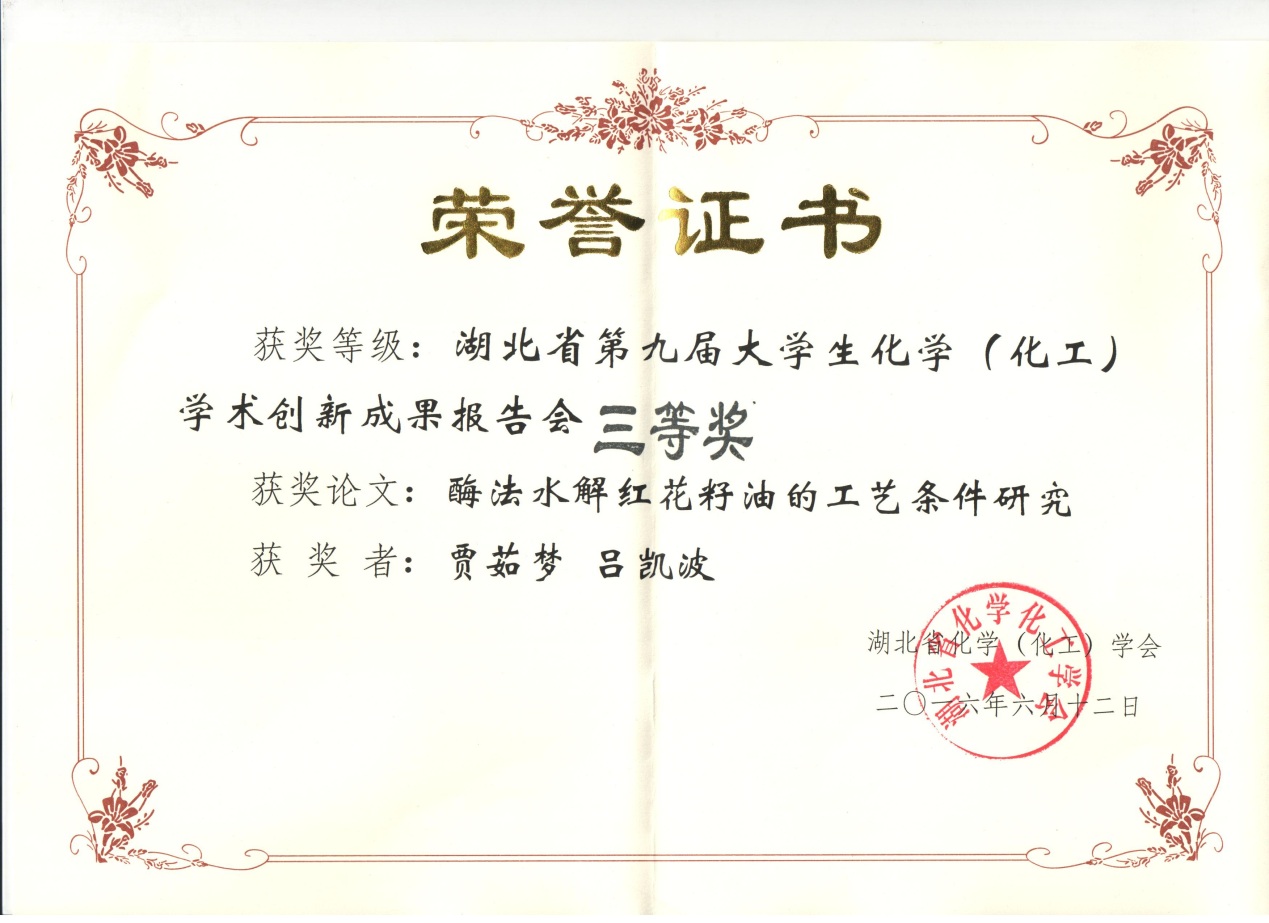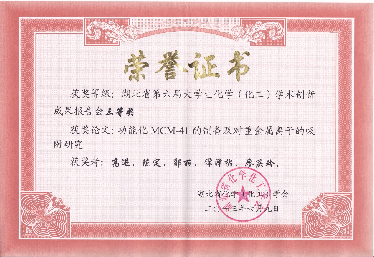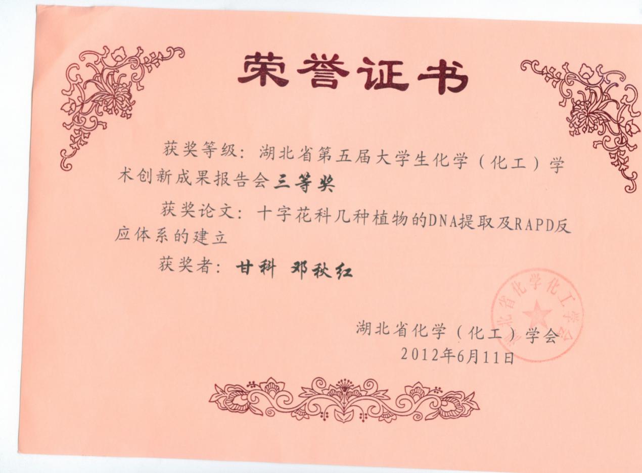2012 | 甘科 | 湖北省第五届大学生化学(化工)学术创新成果报告会 | 湖北省化学化工学会 | 三等奖 | |
