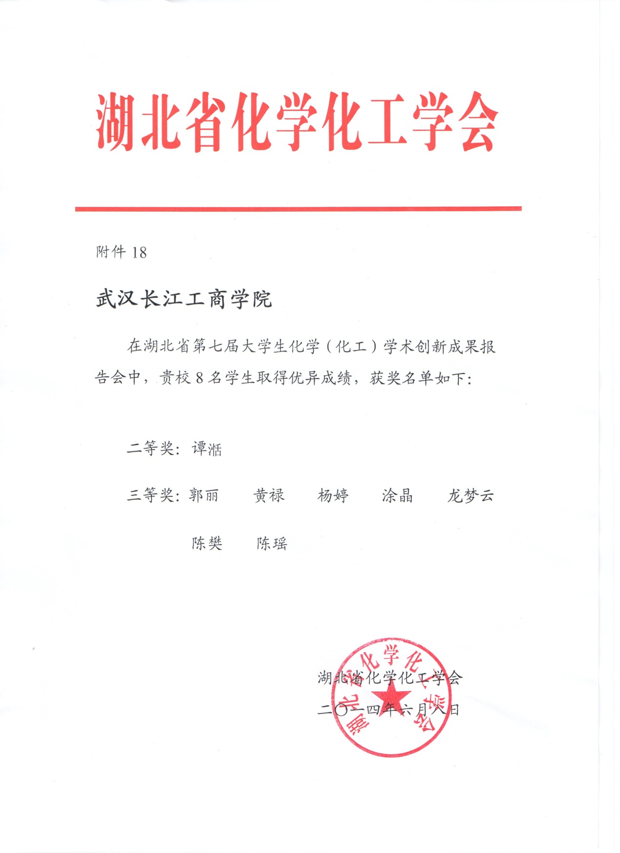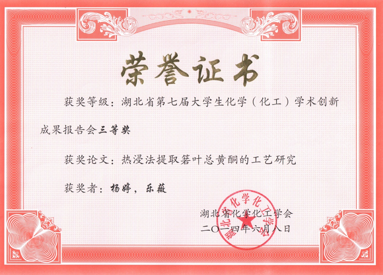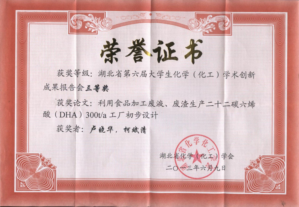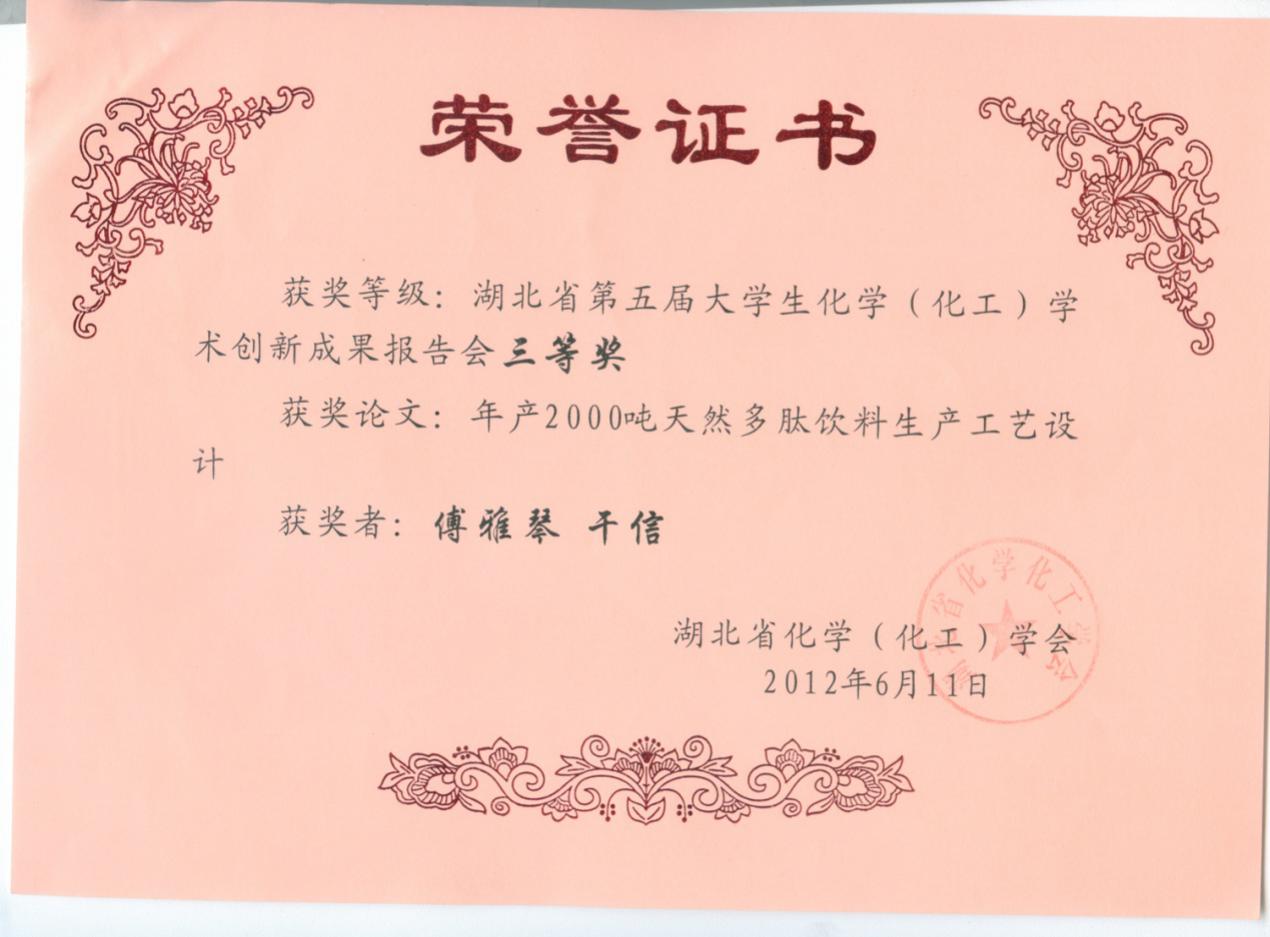 2012 | 甘科 | 湖北省第五届大学生化学(化工)学术创新成果报告会 | 湖北省化学化工学会 | 三等奖 | |