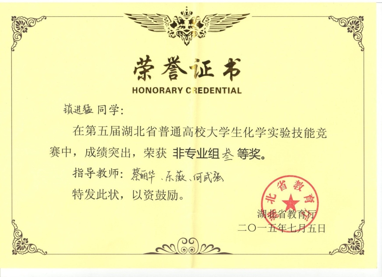 29 | 2015 | 锁进猛 | 第五届湖北省普通高等学校大学生化学实验技能竞赛(非专业组) | 湖北省教育厅 | 三等奖 |