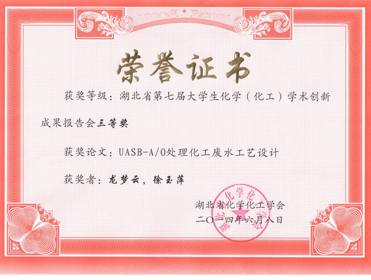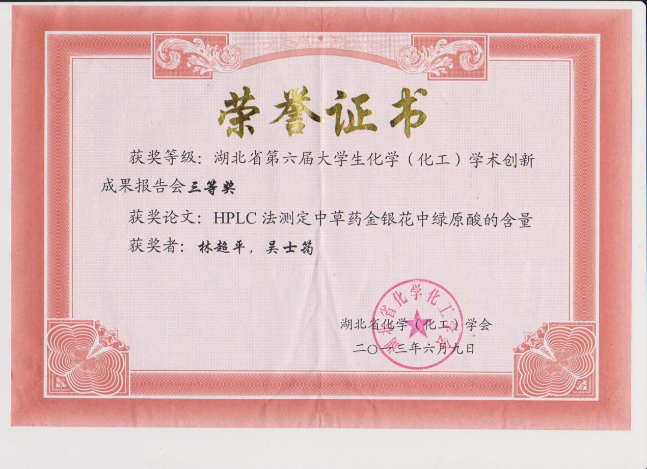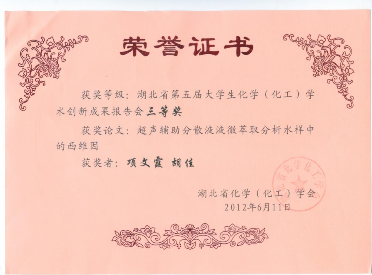 2012 | 项文霞 | 湖北省第五届大学生化学(化工)学术创新成果报告会 | 湖北省化学化工学会 | 三等奖 |