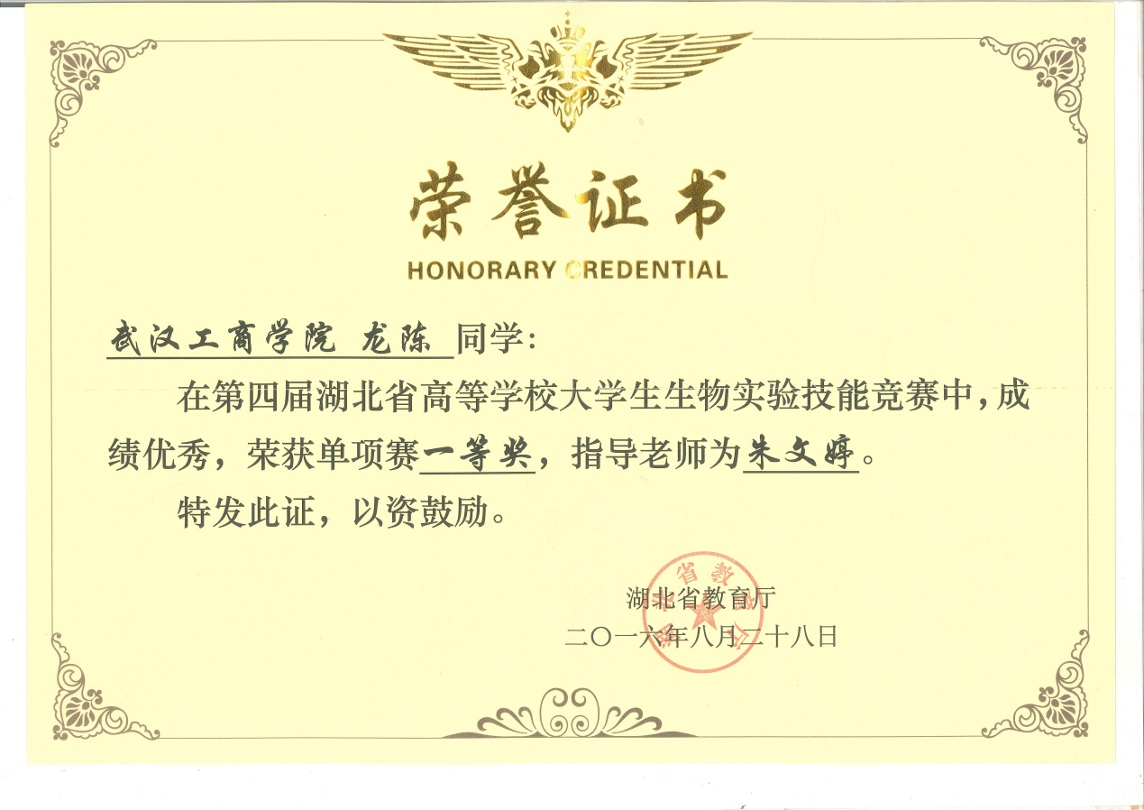 21 | 2016 | 龙陈 | 第四届湖北省高等学校大学生生物实验技能竞赛(单项赛) | 湖北省教育厅 | 一等奖 |