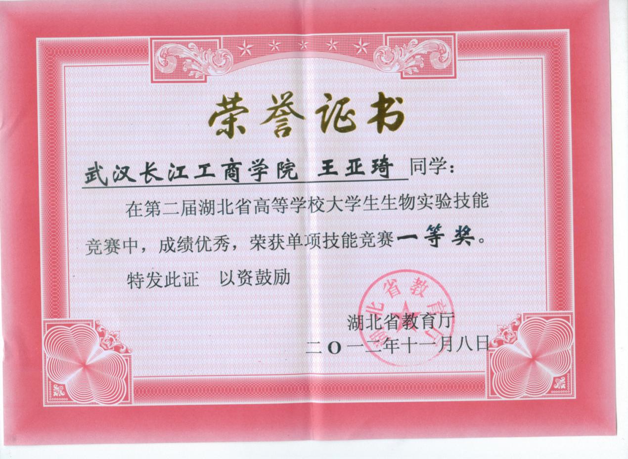 56 | 2012 | 王亚琦 | 第二届湖北省普通高校大学生生物技能竞赛 | 湖北省教育厅 | 一等奖 |