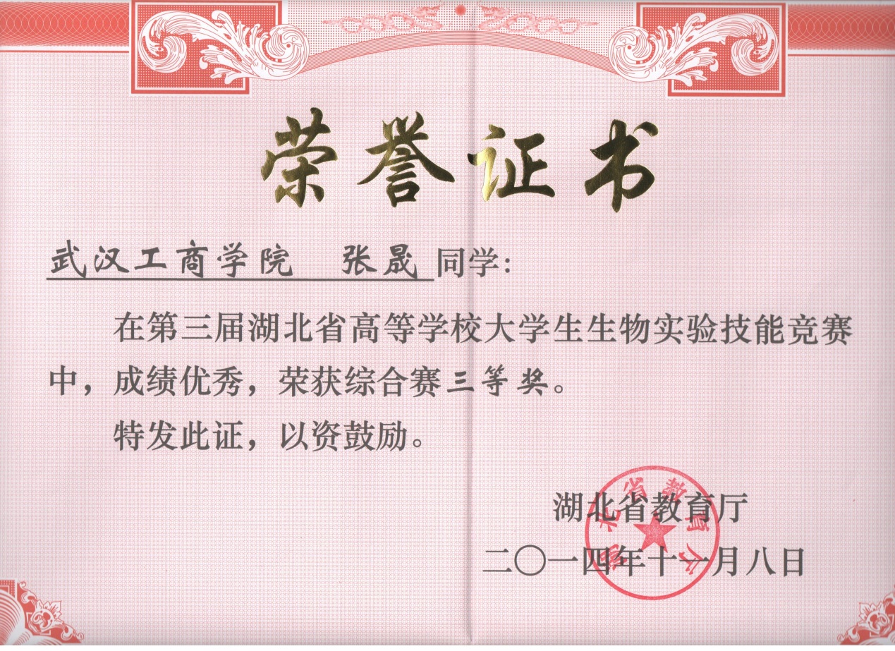 36 | 2014 | 张晟 | 第三届湖北省高等学校大学生生物实验技能竞赛(综合赛) | 湖北省教育厅 | 三等奖 |