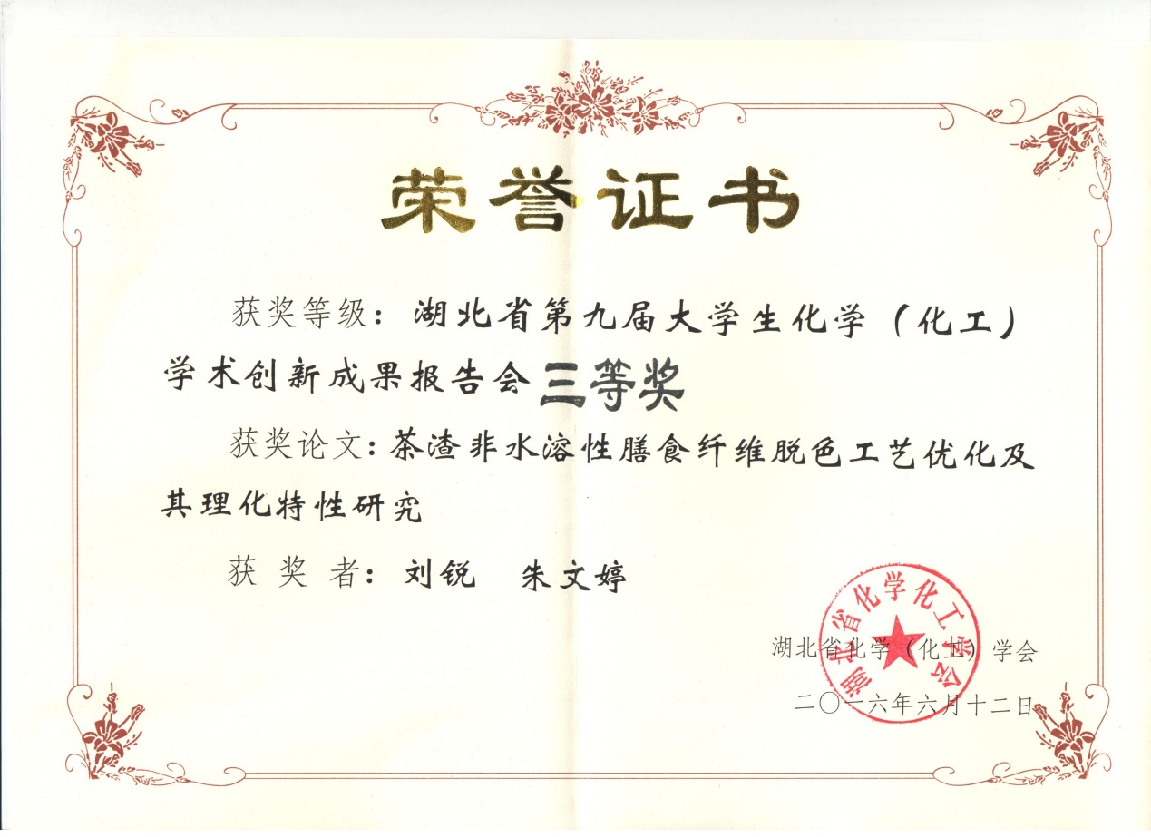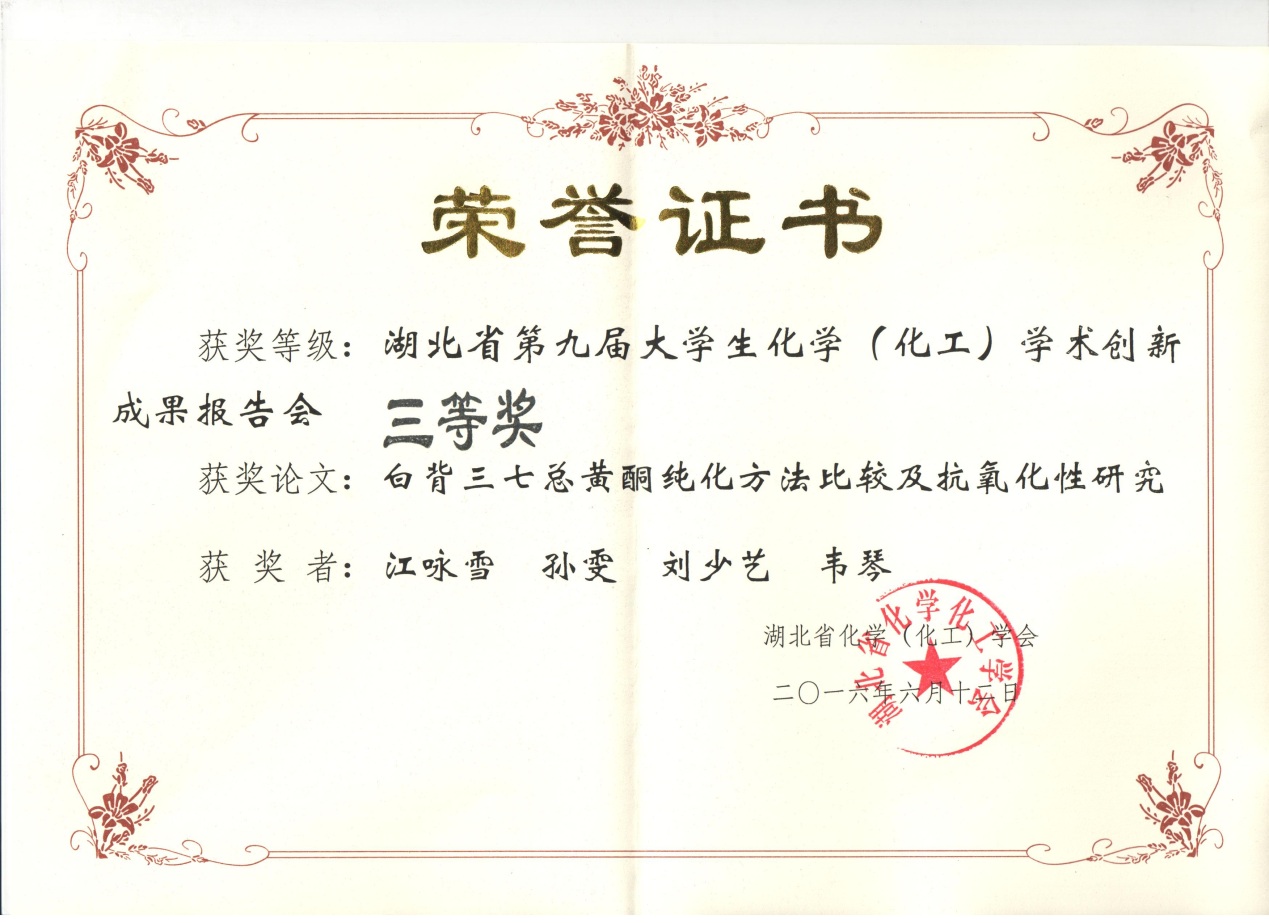 26 | 2016 | 江咏雪,孙雯,刘少艺 | 湖北省第九届大学生化学(化工)学术创新成果报告会 | 湖北省化学化工学会 | 三等奖 |