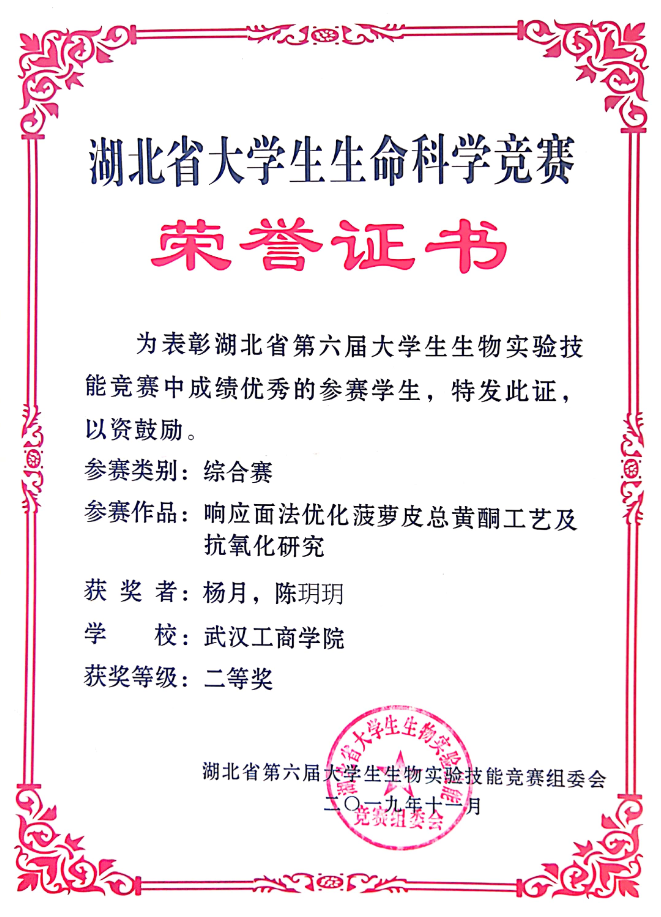1 | 2019 | 杨月、陈玥玥 | 第六届湖北省大学生生物实验技能竞赛综合赛 | 湖北省教育厅 | 二等奖 |