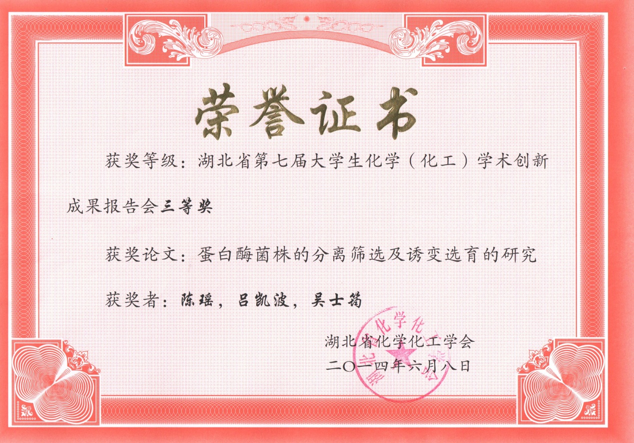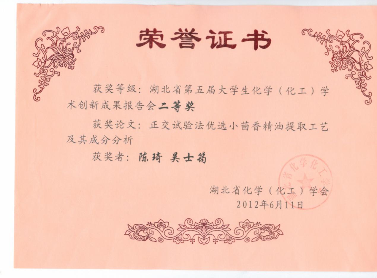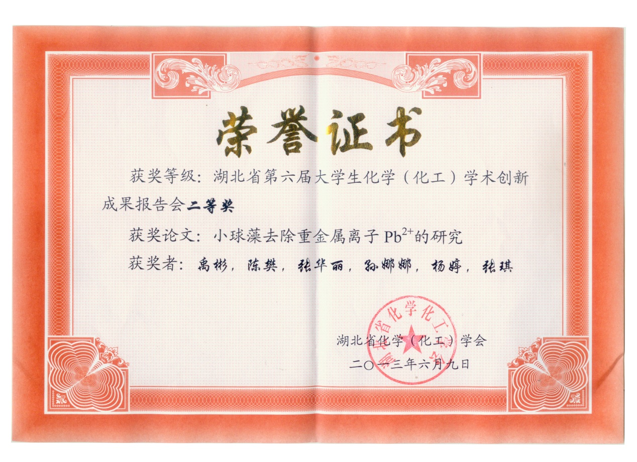 2012 | 陈琦 | 湖北省第五届大学生化学(化工)学术创新成果报告会 | 湖北省化学化工学会 | 二等奖 | |