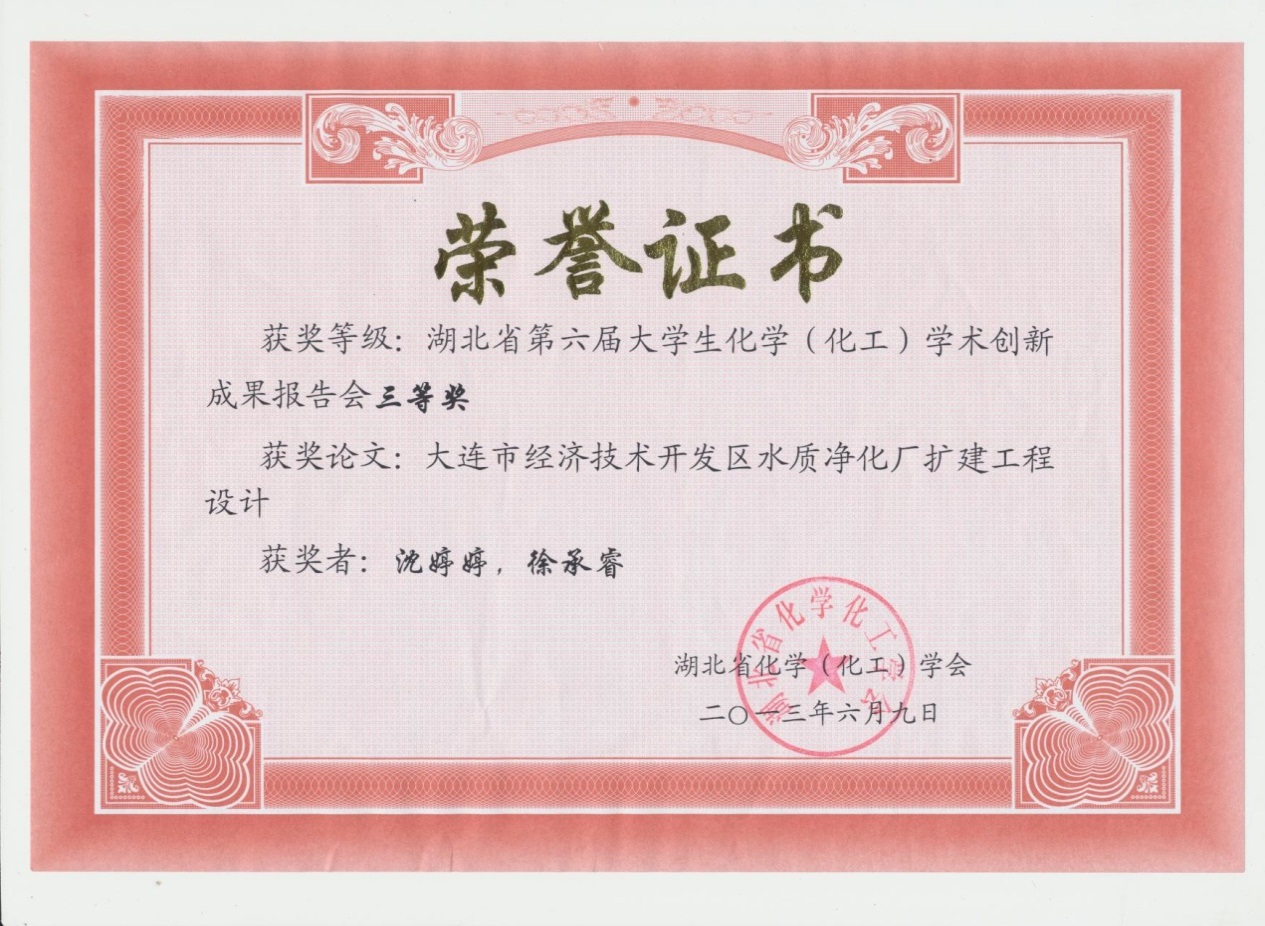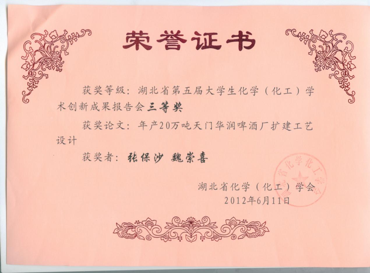2012 | 张保沙 | 湖北省第五届大学生化学(化工)学术创新成果报告会 | 湖北省化学化工学会 | 三等奖 | |