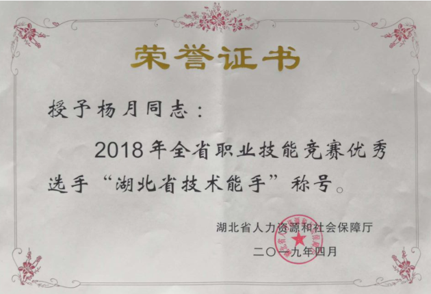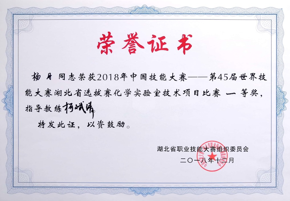 3 | 2018 | 杨月 | 45届世界技能大赛湖北省选拔赛化学实验室技术项目大赛 | 湖北省人力资源和社会保障厅 | 一等奖 |