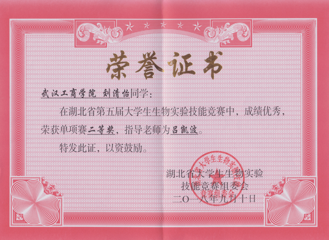 10 | 2018 | 刘清怡 | 第五届湖北省大学生生物实验技能竞赛单项赛 | 湖北省教育厅 | 二等奖 |