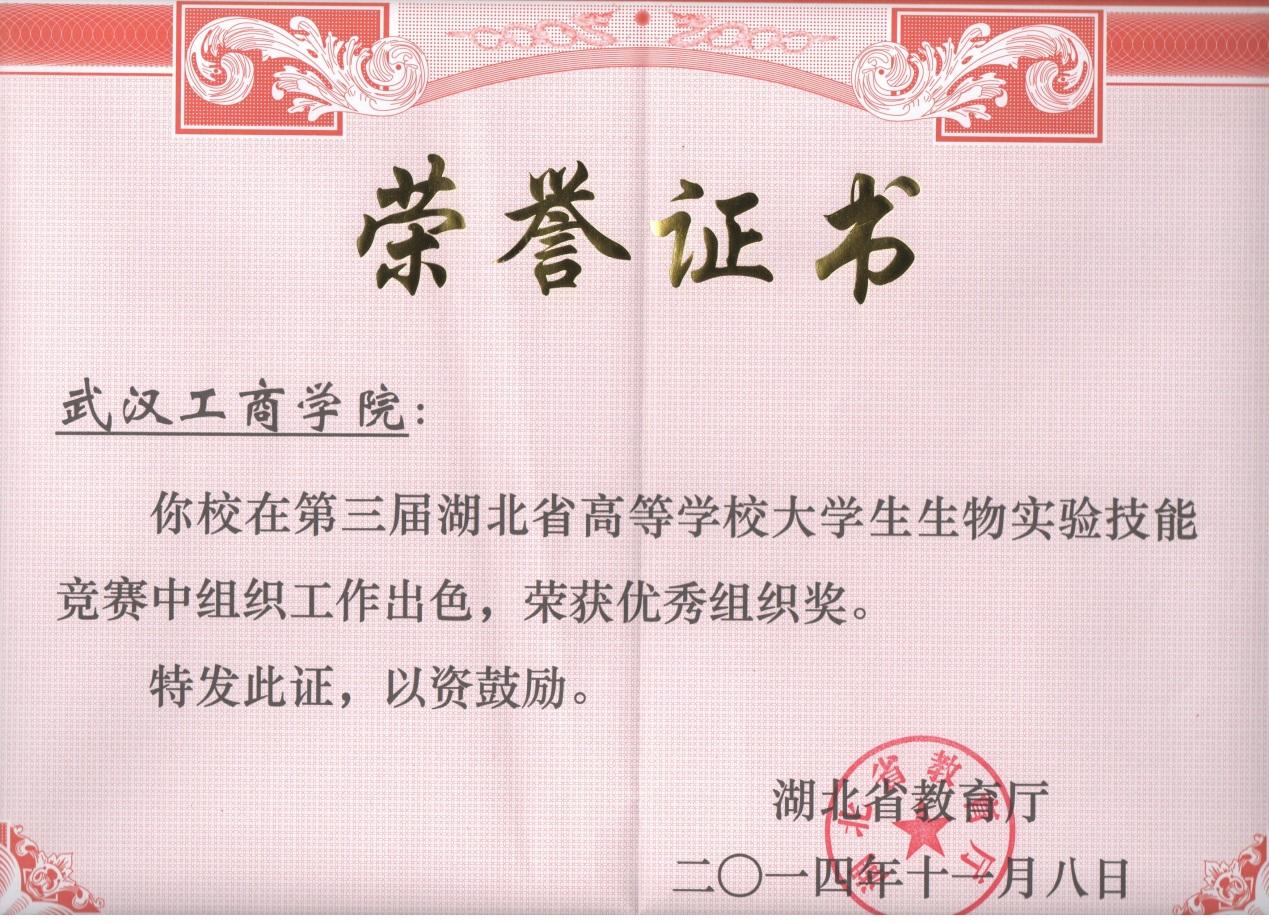 37 | 2014 | 学校 | 第三届湖北省高等学校大学生生物实验技能竞赛 | 湖北省教育厅 | 优秀组织奖 |
