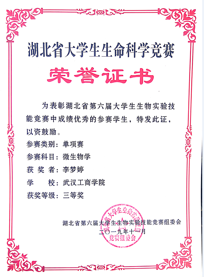 2 | 2019 | 李梦婷 | 第六届湖北省大学生生物实验技能竞赛单项赛 | 湖北省教育厅 | 三等奖 |