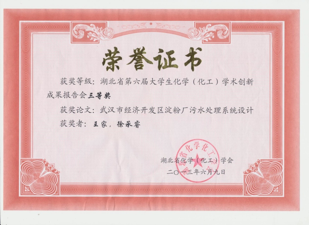 52 | 2013 | 王家 | 湖北省第六届大学生化学(化工)学术创新成果报告会 | 湖北省化学化工学会 | 三等奖 |