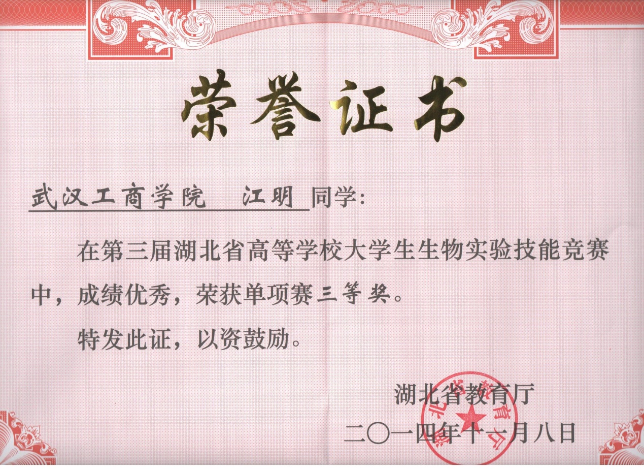 35 | 2014 | 江明 | 第三届湖北省高等学校大学生生物实验技能竞赛(单项赛) | 湖北省教育厅 | 三等奖 |
