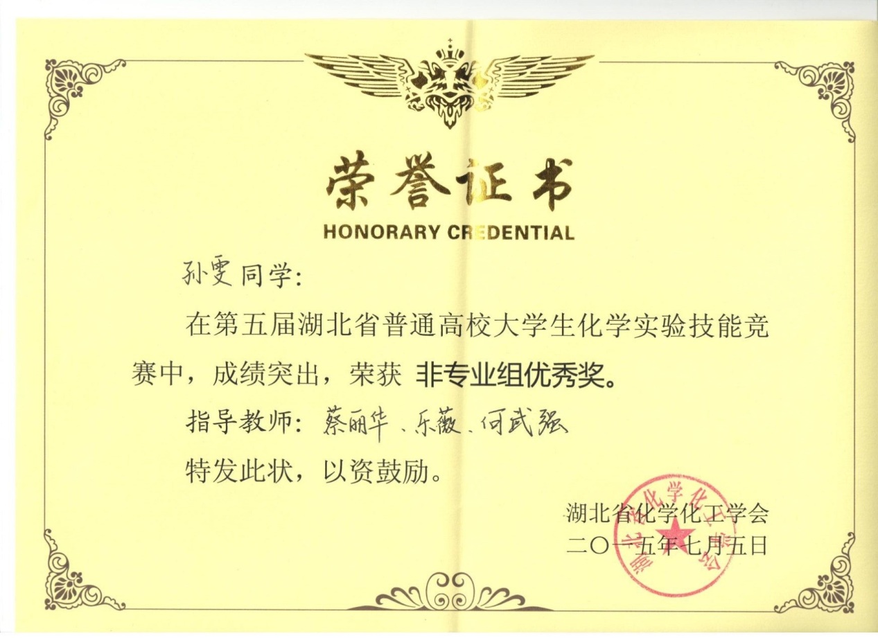 30 | 2015 | 孙雯 | 第五届湖北省普通高等学校大学生化学实验技能竞赛(非专业组) | 湖北省教育厅 | 优秀奖 |